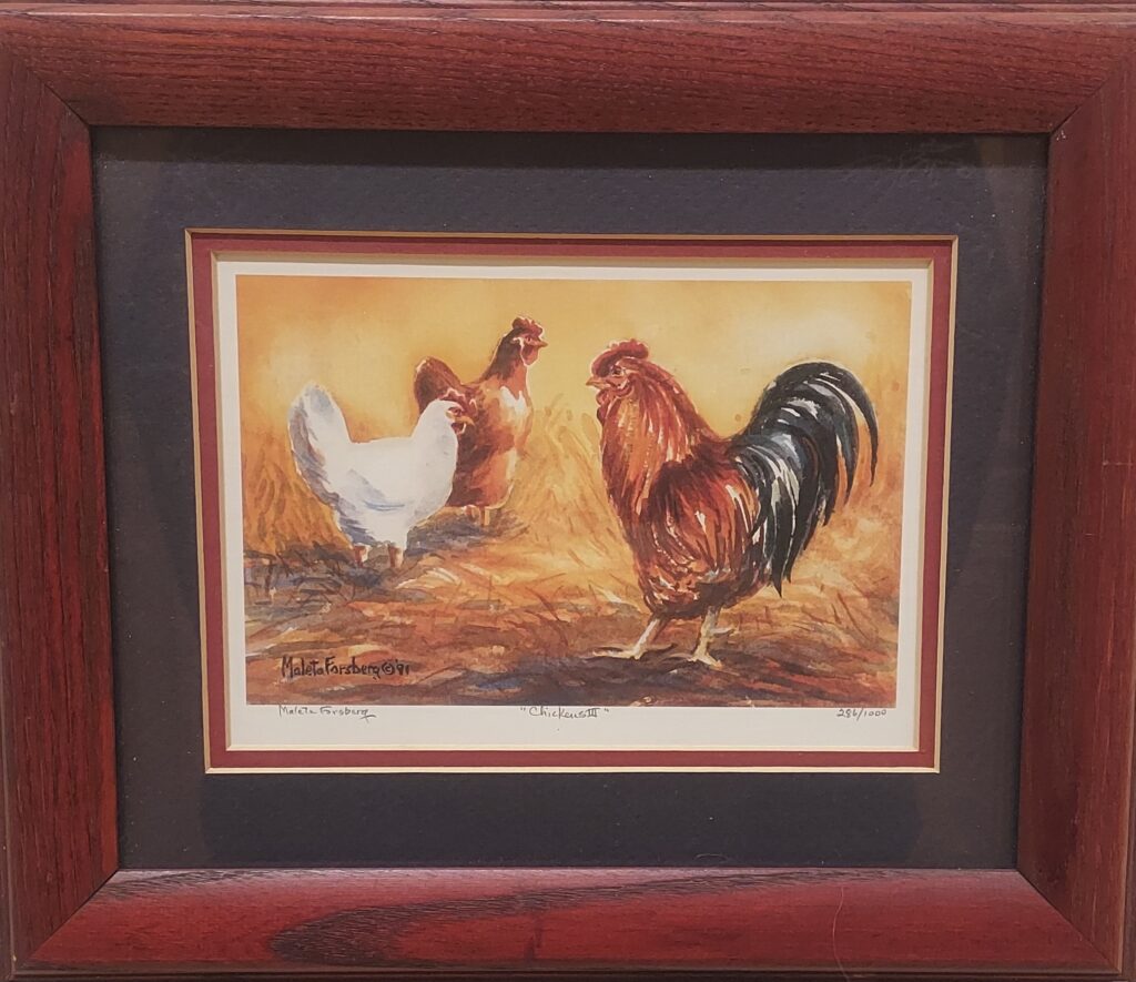 Chickens III by Maleta Forsberg (1932-2025), undated, color facsimile, completed in 286 out of 1000 editions, in good condition. Price: $30