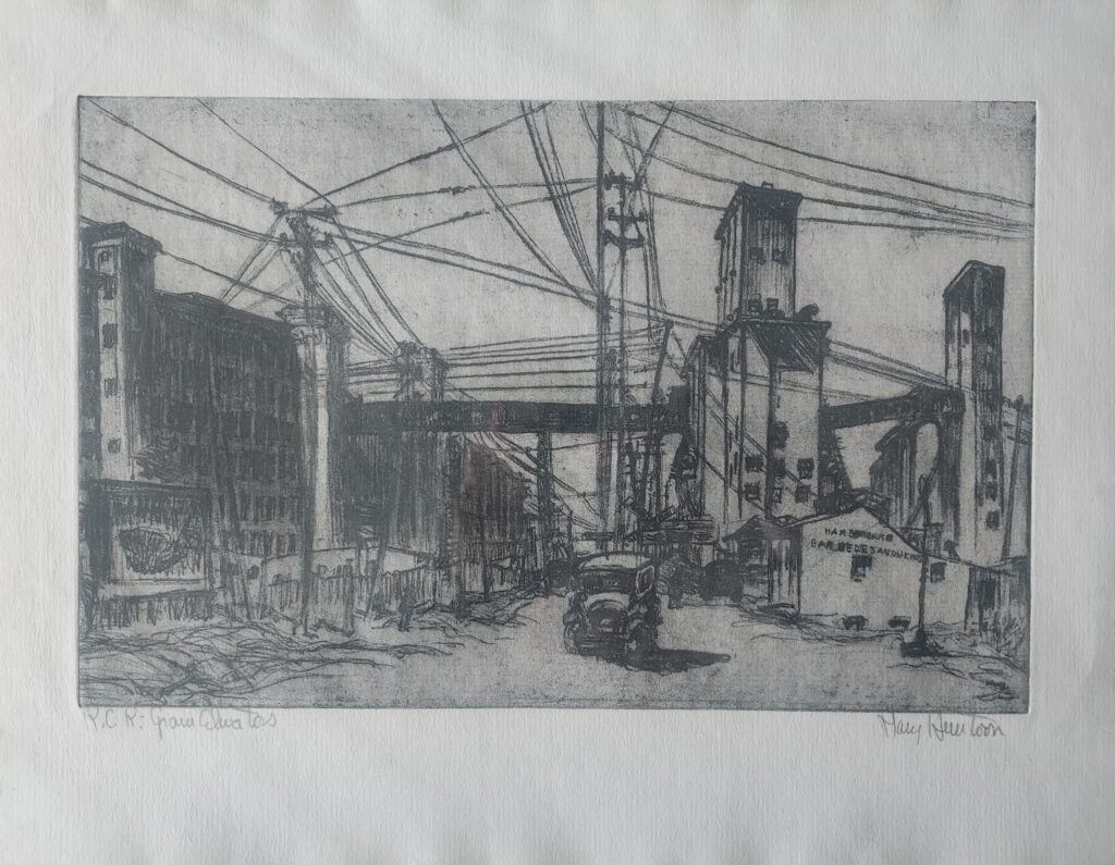 KCK Grain Elevators (Kansas City, Kansas Grain Elevators AKA Factory) by Mary Huntoon (1896-1970), 1936, completed in one edition of 180, 7 x 10 inches, in good condition. Price: $300