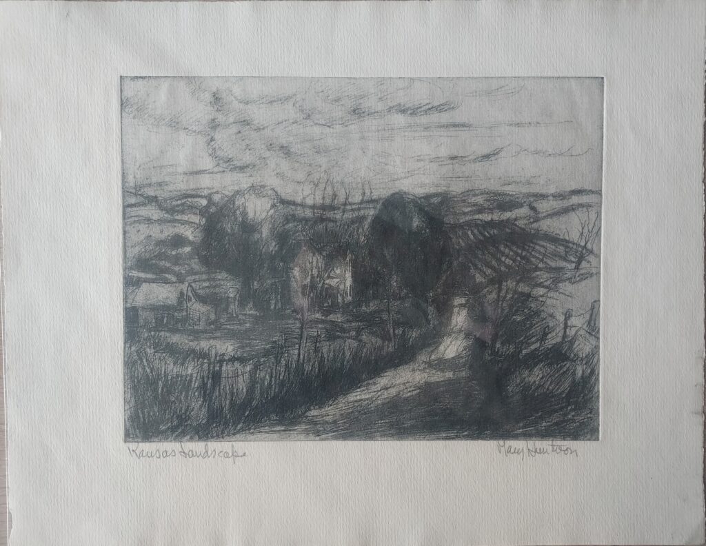 Kansas Landscape by Mary Huntoon (1896-1970), 1937, sandground etching, completed in one edition of 100, 6 3/4 x 8 3/4 inches, in good condition. Price: $300
