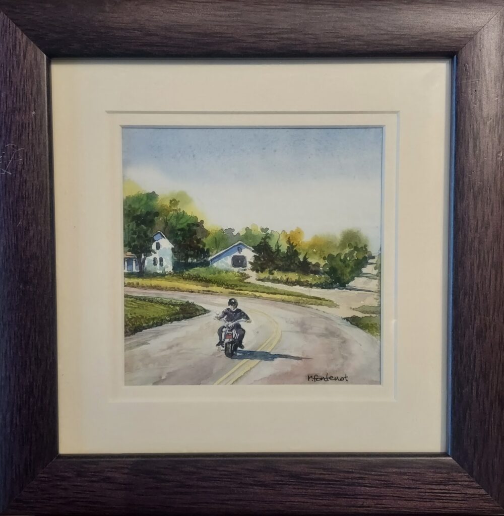 2 Lanes, 2 Wheels by Ralph Fontenot (Manhattan, KS) 2001, watercolor, 4 x 4 inches, framed to 7 1/2 x 7 1/2 inches, in excellent condition. Price $175