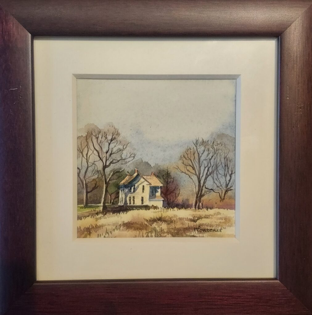 Uteva’s House by Ralph Fontenot (Manhattan, KS) 2001, watercolor, 4 x 4 inches, framed to 7 1/2 x 7 1/2 inches, in excellent condition. Price $175