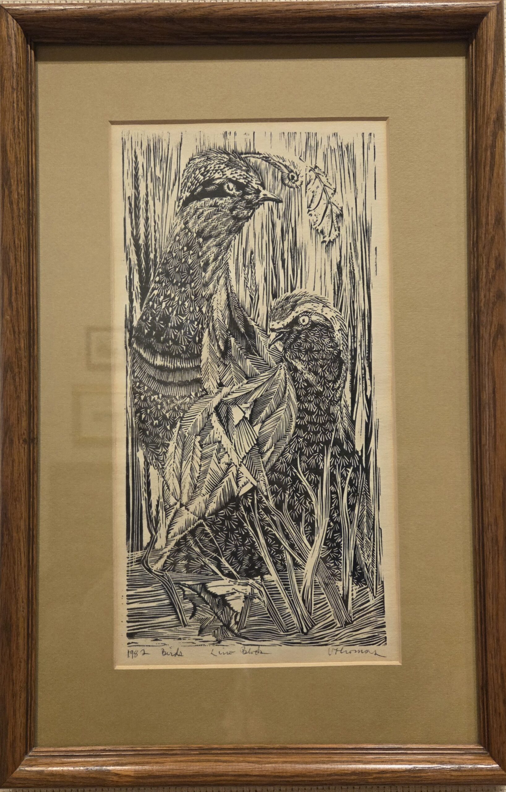 Birds by Victor Thomas, 1982, linocut, 12 x 6 inches, framed to 17 ½ x 11 ½ inches, in good condition. Price $60