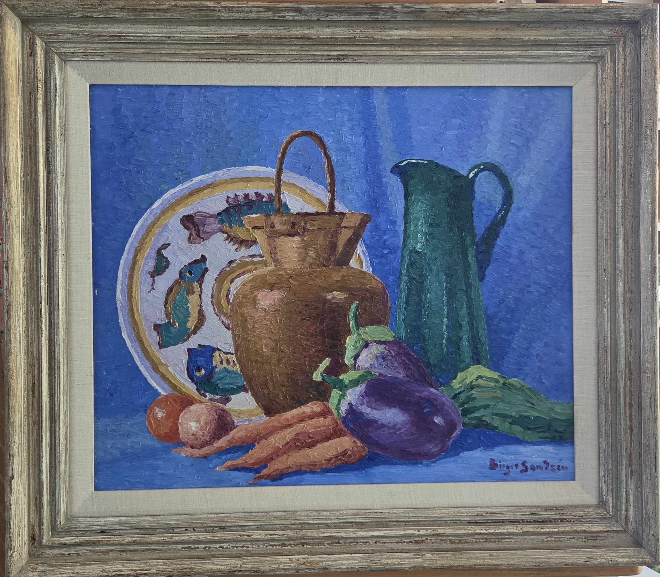 Carrots and Italian Bowl by Birger Sandzén, 1941, oil on board, 20 x 24 inches, in good condition. Price $30,000