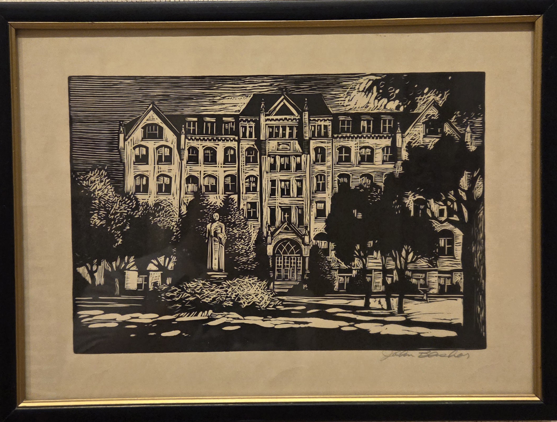 Old Main by John Bashor (1926-2013), 1963, woodcut, 8 x 12 inches, framed to 12 1/4 x 16 1/4 inches, in good condition. Price $200
