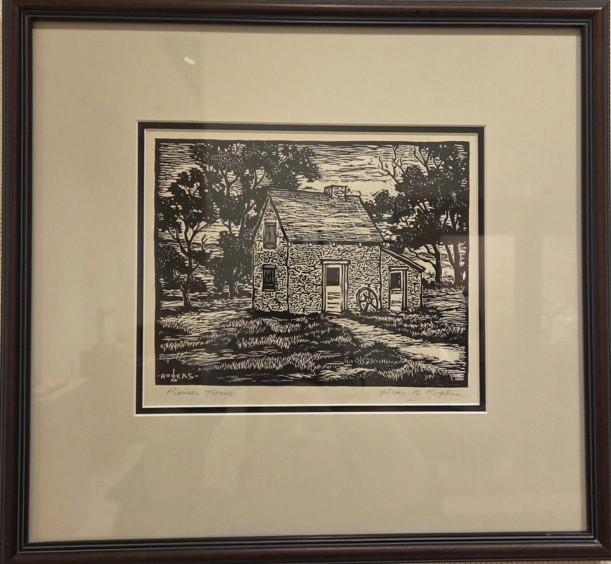 Pioneer Home by Charles Rogers (1911-1987), undated, linocut, in good condition. Price $250
