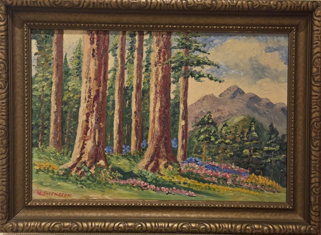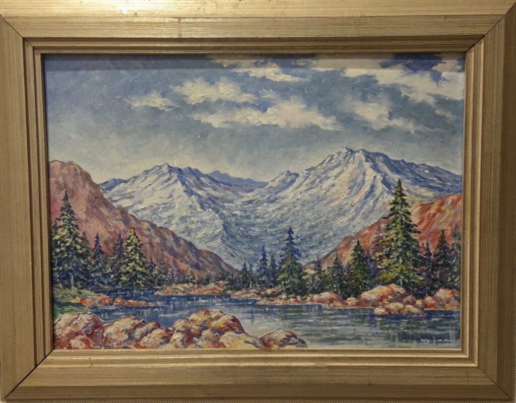 Untitled (Trees and Mountains) by Hannah Swensson, undated, 12 x 18 inches, in good condition. Price $300