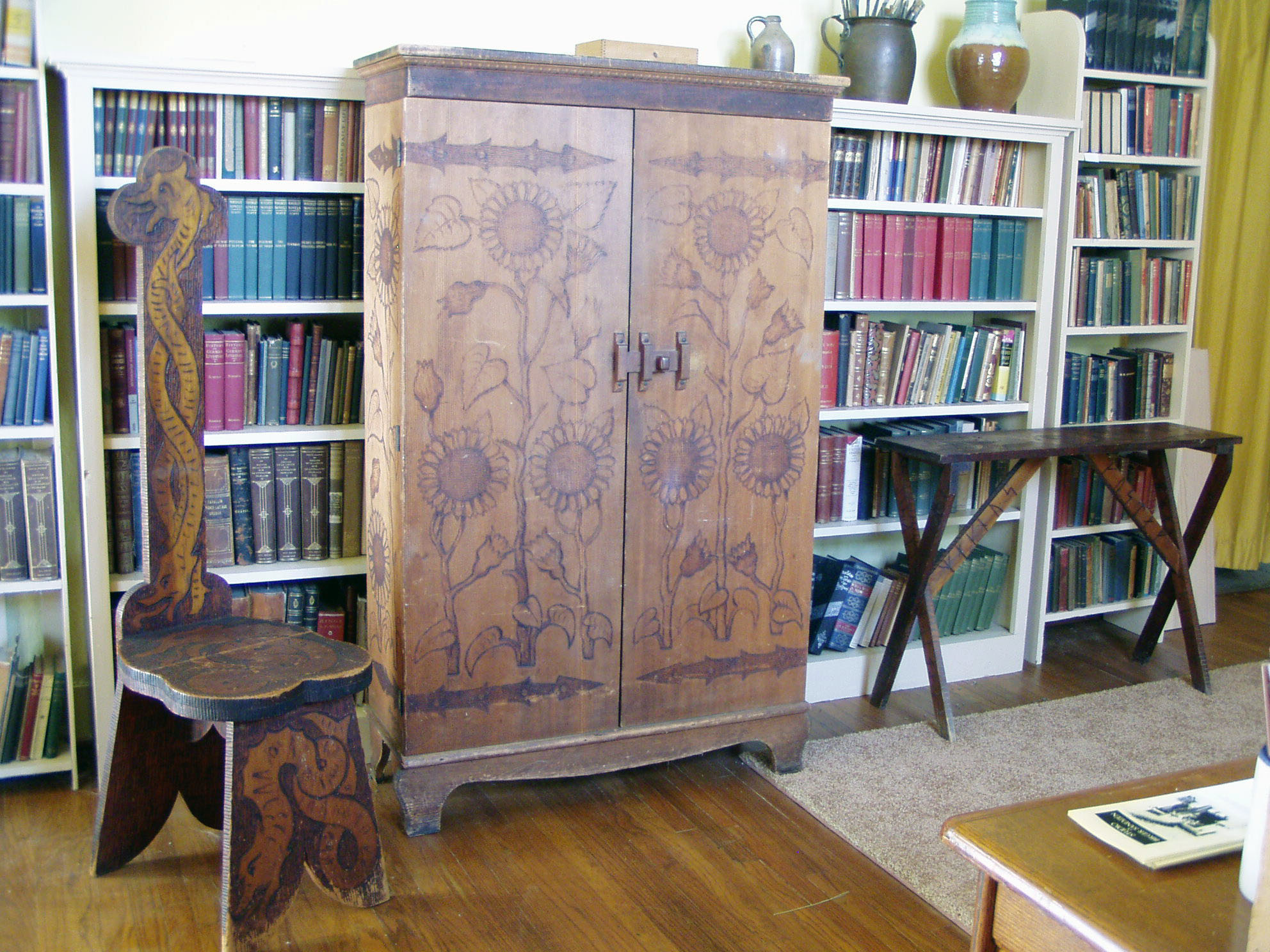 In January 1902, Birger Sandzén wrote to his father, “In my free time lately I have amused myself with attempts at crafts.” Before Christmas I made a chair in Old Norse style with burned weapons and illustrations for Fritjof’s Saga. The chair was very artistic and original.”
