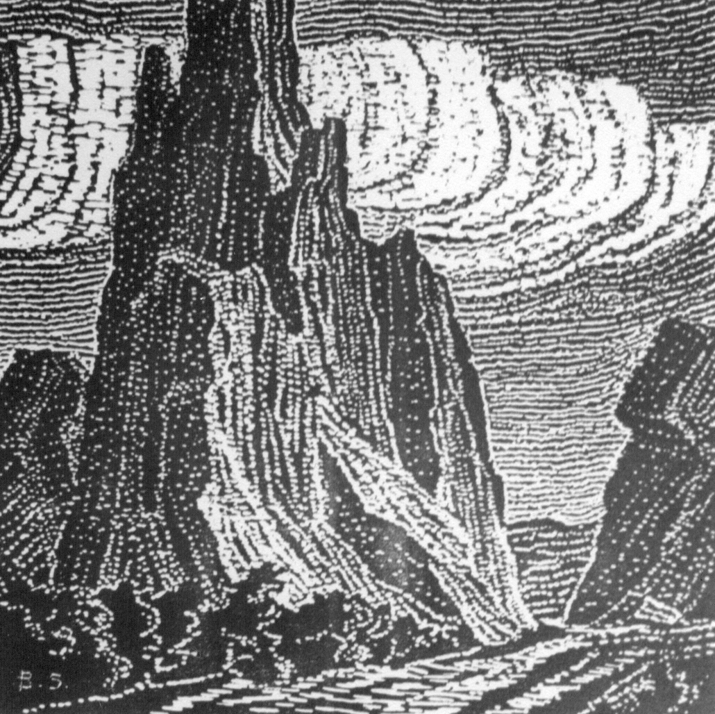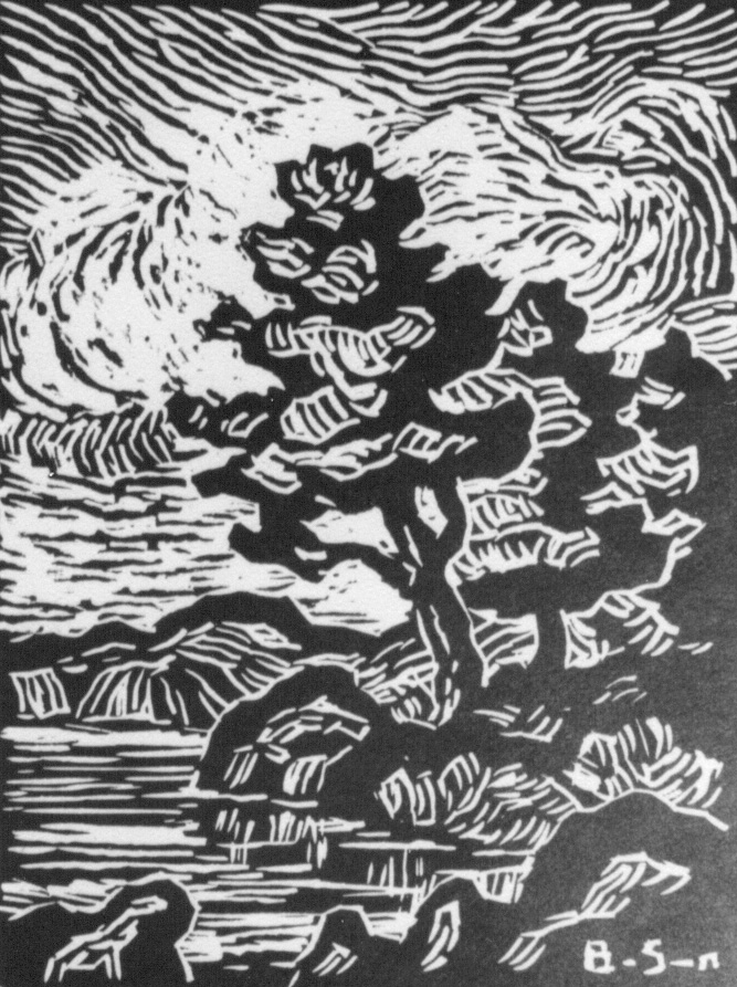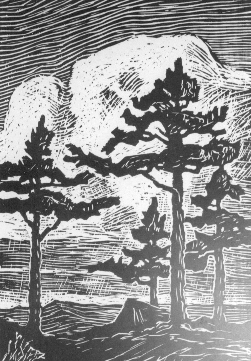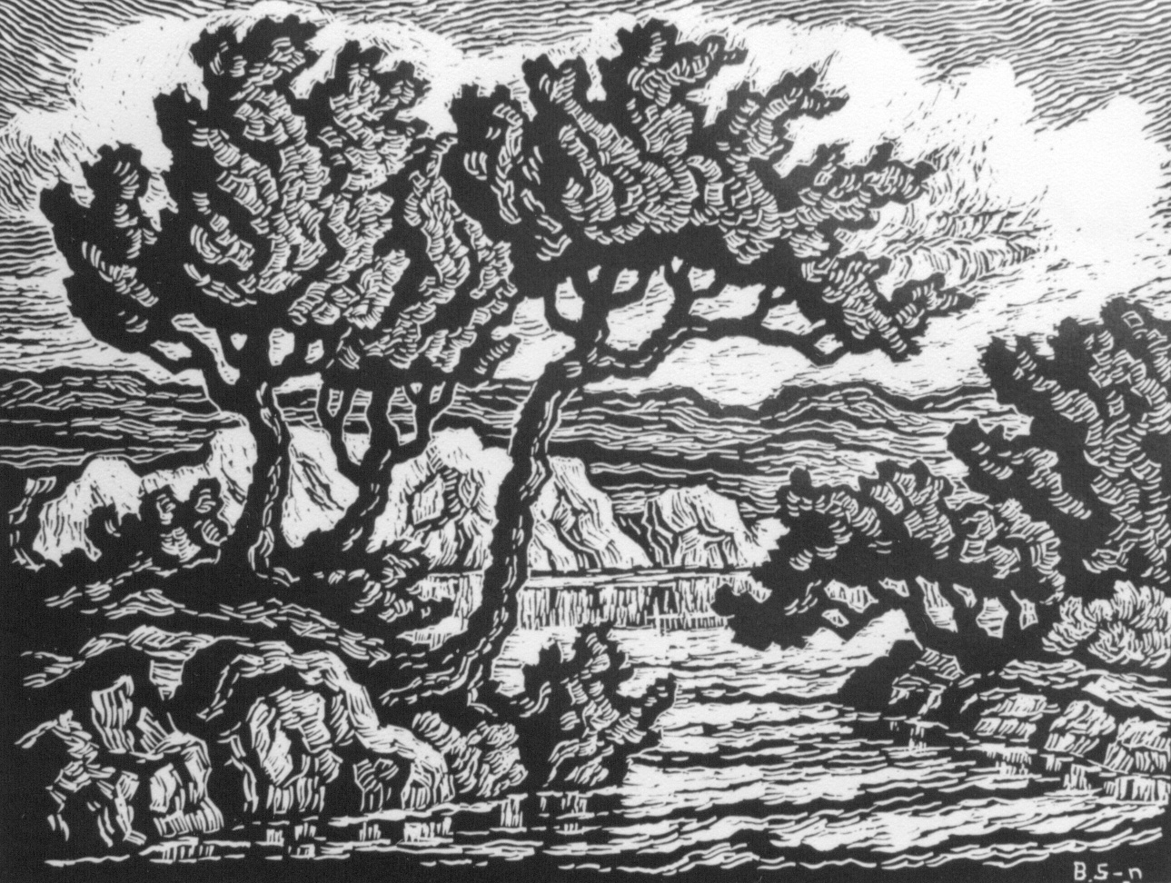 Birger Sandzén created block prints using two materials, wood and linoleum. Initially, he created traditional woodcuts using gouges to cut impressions in a wood block. He also developed a pointillist technique utilizing the tip of a square nail to make impressions in the block. His daughter, Margaret, referred to these works as nailcuts. Later, beginning in 1921, he produced linoleum cuts.