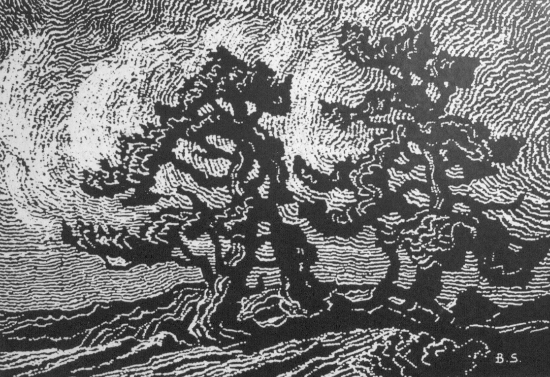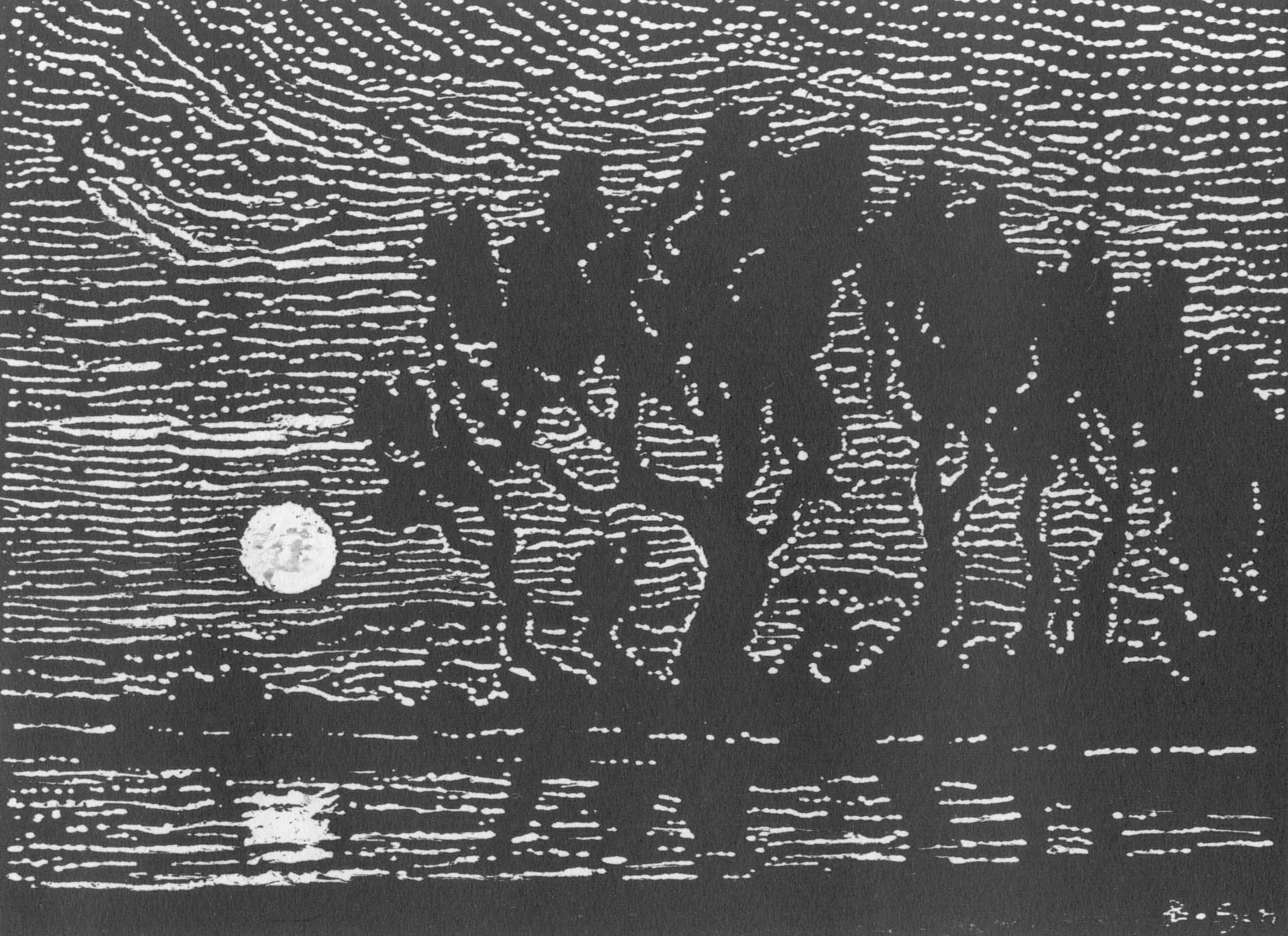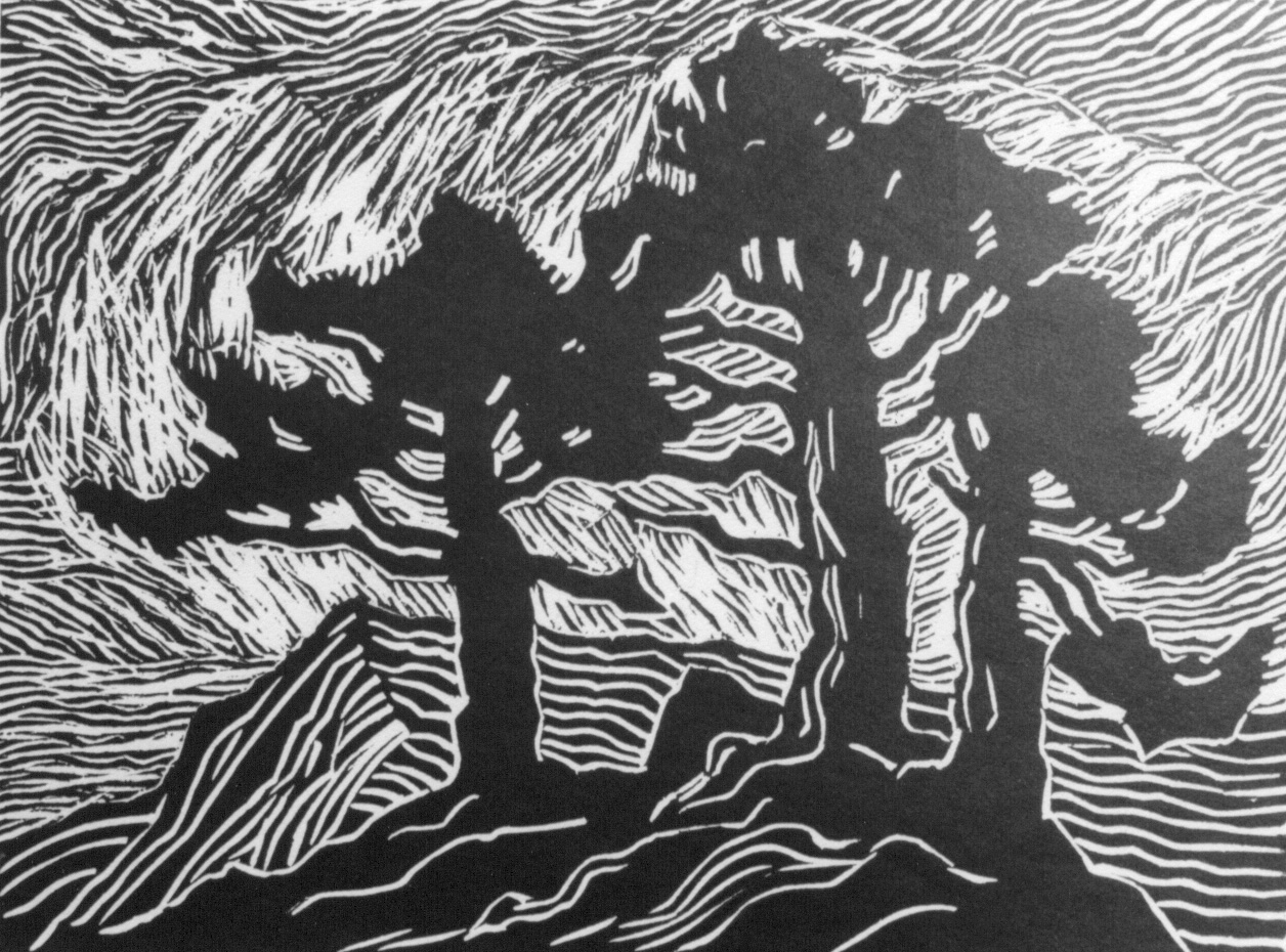 Birger Sandzén created block prints using two materials, wood and linoleum. Initially, he created traditional woodcuts using gouges to cut impressions in a wood block. He also developed a pointillist technique utilizing the tip of a square nail to make impressions in the block. His daughter, Margaret, referred to these works as nailcuts. Later, beginning in 1921, he produced linoleum cuts.