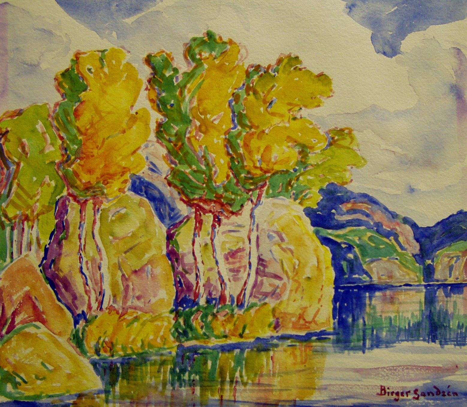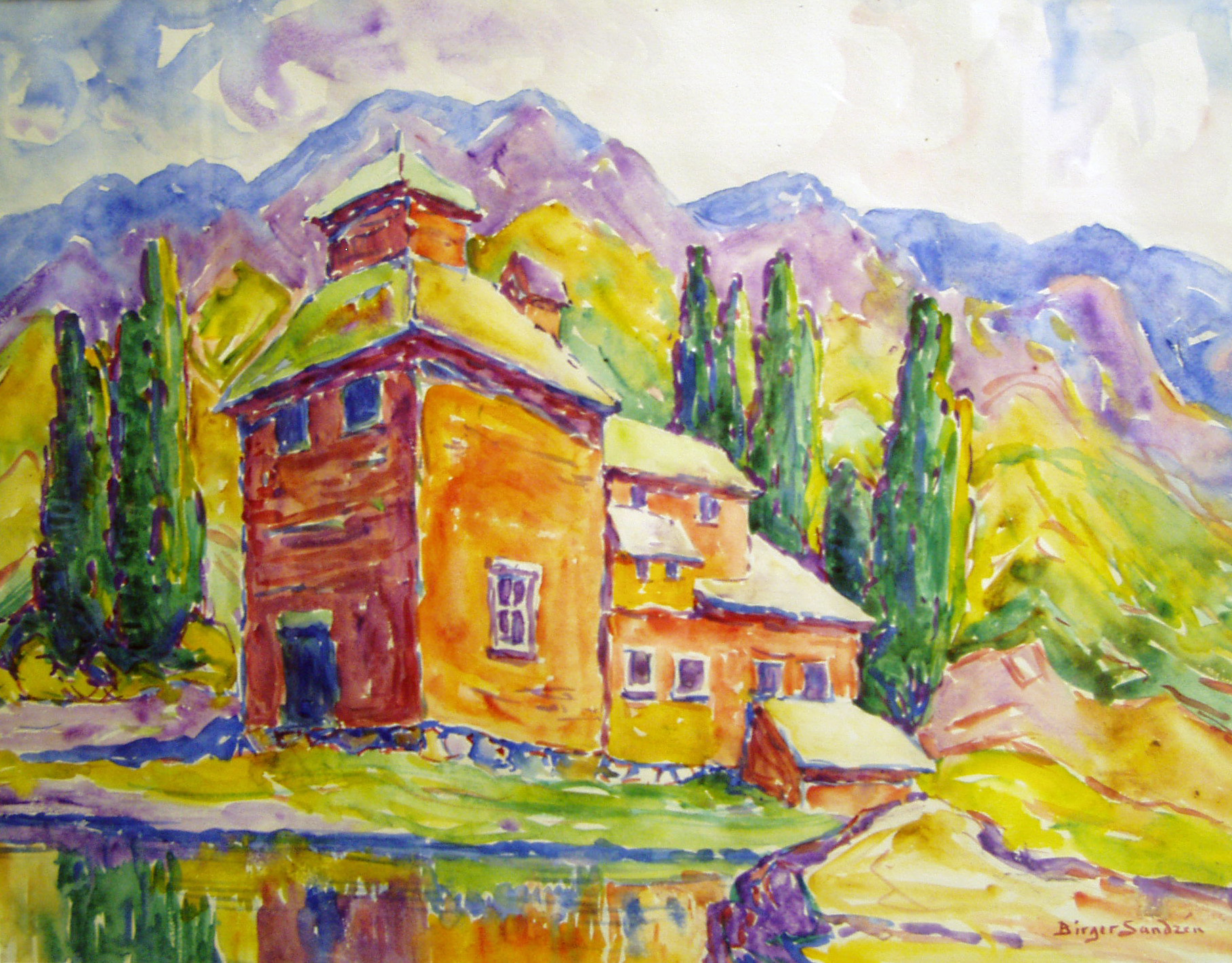Although oil paintings dominated his artistic output, Birger Sandzén was an exceptional watercolorist – completing in excess of 500 watercolors in his lifetime. His watercolors were critically acclaimed and he maintained memberships in several important societies. He was the founder and member of the Prairie Water Color Painters. Additionally, he was a member of the American Water Color Society, the New York Water Color Club, the Philadelphia Water Color Club, and the California Water Color Society.